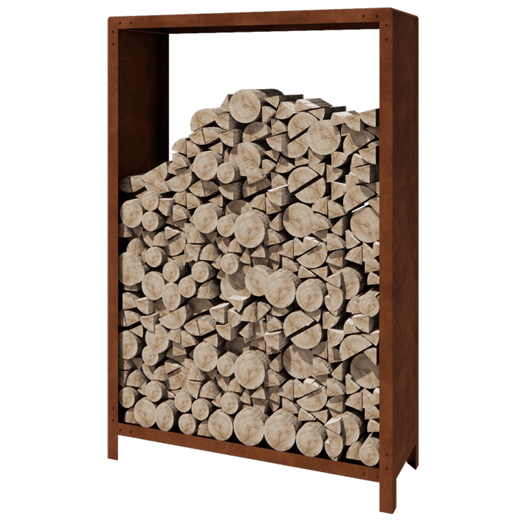 The log storage is made from high-quality corten steel. The rusting process begins within weeks to months, developing a visible warm orange-brown color. It can take 1 to 2 years for the rusting process to fully complete. The rusting can be accelerated using the MySteel rust accelerator. This rust layer protects the steel from further corrosion and gives the product a natural, vibrant appearance.