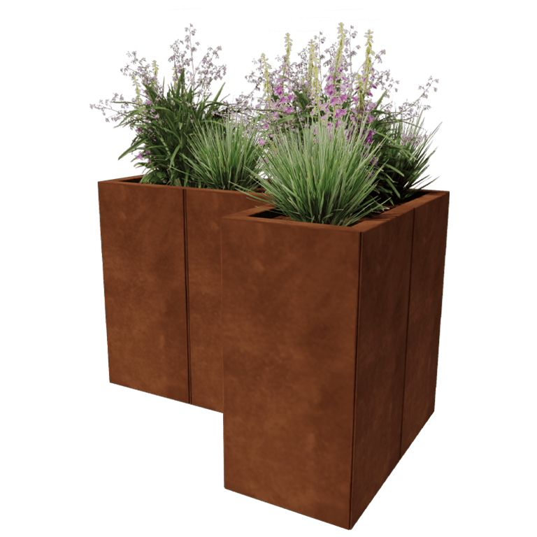 This planter is a modular steel planter that comes as a kit. The planter is constructed from individual panels and corner pieces. The planters can be connected completely blind. No fasteners are visible. Because of our modular system, very large dimensions are also possible. By using corner pieces, unique shapes are possible that are not available anywhere else as standard. See the manual for more information.