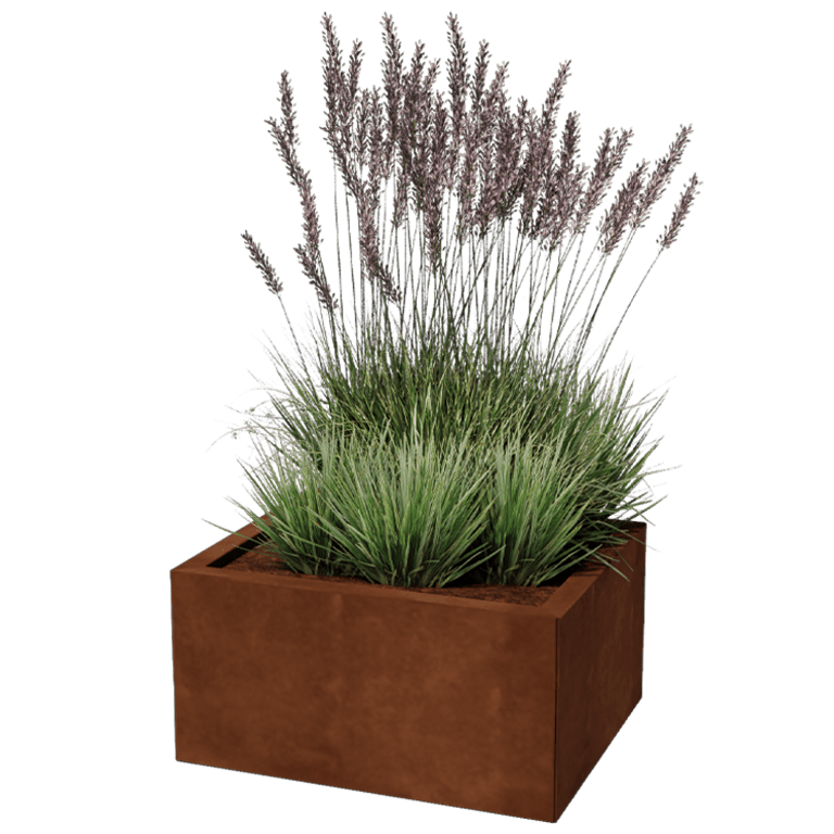 The panels of our modular planters are manufactured from high-quality Corten-A steel plate. This type of metal has the unique property of forming a very dense oxide skin (rust layer). Rusting through is therefore impossible. Because of the dense oxide skin, the deeper lying material is shielded from oxygen, thus oxidation is greatly delayed while corrosion continues. The Corten steel planter is delivered unrusted, in the gray metallic color. The rusting process begins after weeks to 2 months, no treatment is required. During the rusting process, the planter may shed. Corten steel is a metal alloy consisting of iron, to which copper, phosphorus, silicon, nickel and chromium are added.