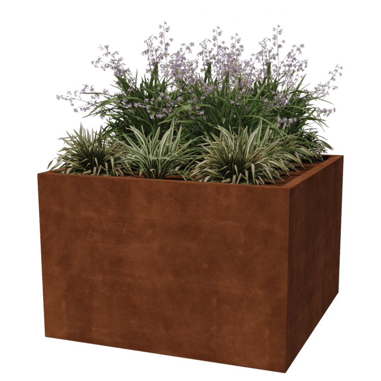 These planters are manufactured from high-quality Corten-A steel plate. This type of metal has the unique property of forming a very dense oxide skin (rust layer). Rusting through is therefore impossible. Due to the dense oxide layer, the underlying material is protected from oxygen, which slowsdown the oxidation process while the corrosion continues. The Corten steel planter is delivered unrusted, in the gray metallic color. The rusting process starts in the first 2 months, no treatment is required. During the rusting process, the planter may come off. Corten steel is a metal alloy consisting of iron and to this are added copper, phosphorus, silicon, nickel and chromium.