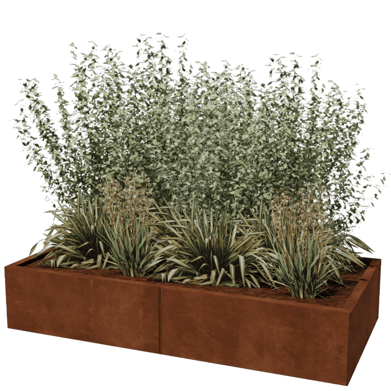 The panels of our modular planters are manufactured from high-quality Corten-A steel plate. This type of metal has the unique property of forming a very dense oxide skin (rust layer). Rusting through is therefore impossible. Because of the dense oxide skin, the deeper lying material is shielded from oxygen, thus oxidation is greatly delayed while corrosion continues. The Corten steel planter is delivered unrusted, in the gray metallic color. The rusting process begins after weeks to 2 months, no treatment is required. During the rusting process, the planter may shed. Corten steel is a metal alloy consisting of iron, to which copper, phosphorus, silicon, nickel and chromium are added.