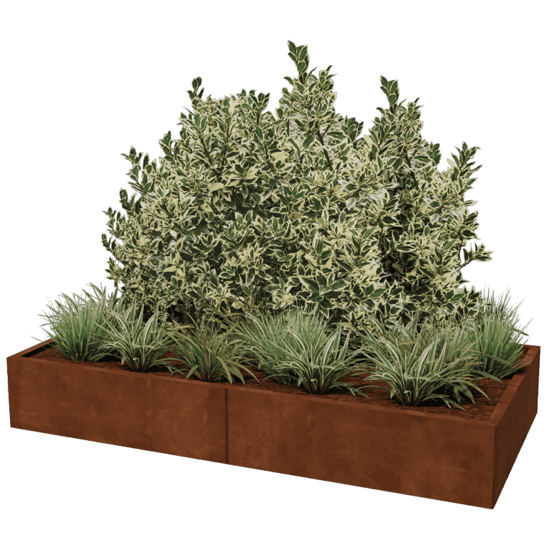 The panels of our modular planters are manufactured from high-quality Corten-A steel plate. This type of metal has the unique property of forming a very dense oxide skin (rust layer). Rusting through is therefore impossible. Because of the dense oxide skin, the deeper lying material is shielded from oxygen, thus oxidation is greatly delayed while corrosion continues. The Corten steel planter is delivered unrusted, in the gray metallic color. The rusting process begins after weeks to 2 months, no treatment is required. During the rusting process, the planter may shed. Corten steel is a metal alloy consisting of iron, to which copper, phosphorus, silicon, nickel and chromium are added.