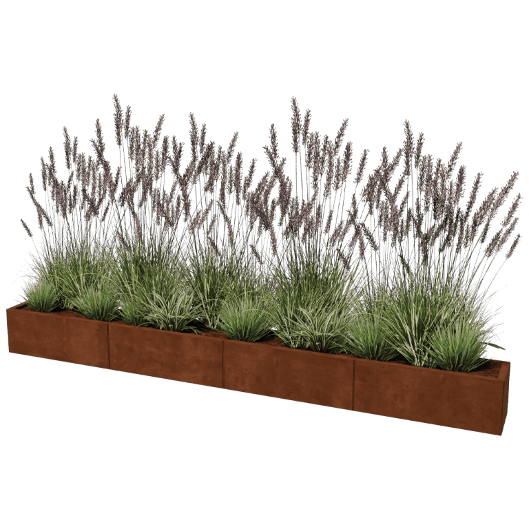 The panels of our modular planters are manufactured from high-quality Corten-A steel plate. This type of metal has the unique property of forming a very dense oxide skin (rust layer). Rusting through is therefore impossible. Because of the dense oxide skin, the deeper lying material is shielded from oxygen, thus oxidation is greatly delayed while corrosion continues. The Corten steel planter is delivered unrusted, in the gray metallic color. The rusting process begins after weeks to 2 months, no treatment is required. During the rusting process, the planter may shed. Corten steel is a metal alloy consisting of iron, to which copper, phosphorus, silicon, nickel and chromium are added.