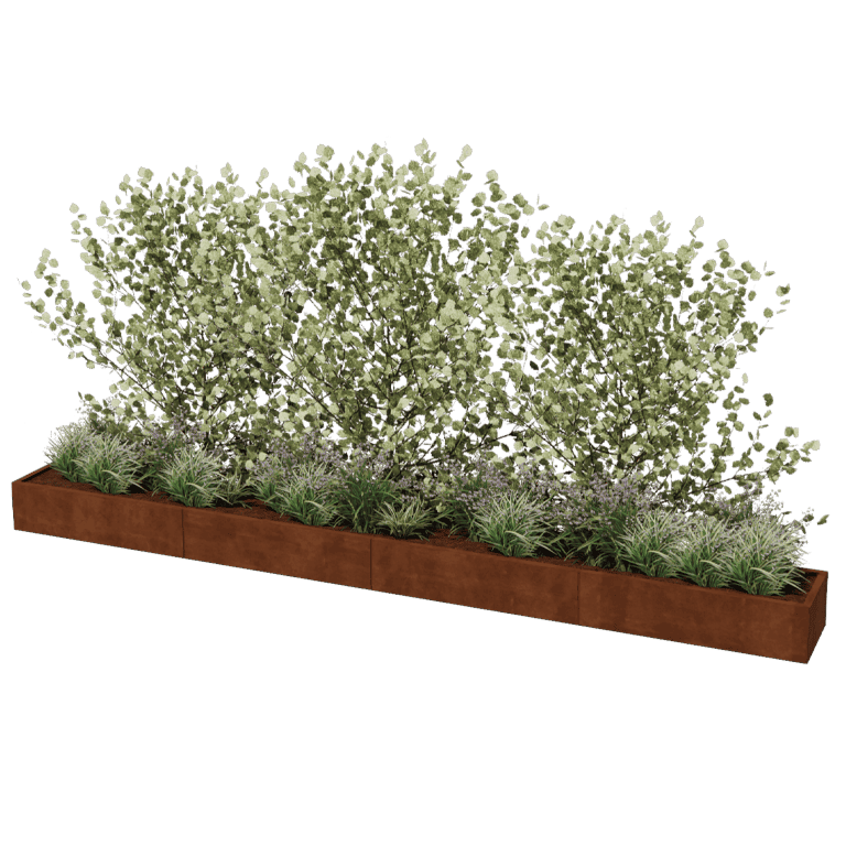 The panels of our modular planters are manufactured from high-quality Corten-A steel plate. This type of metal has the unique property of forming a very dense oxide skin (rust layer). Rusting through is therefore impossible. Because of the dense oxide skin, the deeper lying material is shielded from oxygen, thus oxidation is greatly delayed while corrosion continues. The Corten steel planter is delivered unrusted, in the gray metallic color. The rusting process begins after weeks to 2 months, no treatment is required. During the rusting process, the planter may shed. Corten steel is a metal alloy consisting of iron, to which copper, phosphorus, silicon, nickel and chromium are added.