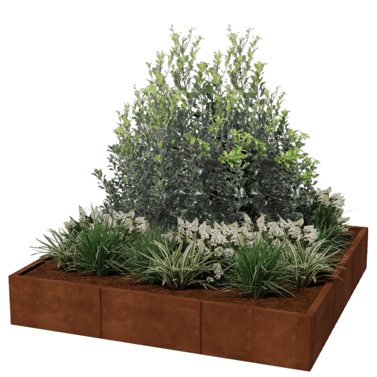 This planter is a modular steel planter that comes as a kit. The planter is constructed from separate panels and corner pieces. The planters can be connected completely blind. There are no fasteners in sight. Because of our modular system, very large sizes are possible. By using corner pieces, unique shapes are possible that are not available anywhere else. See the manual for more information.