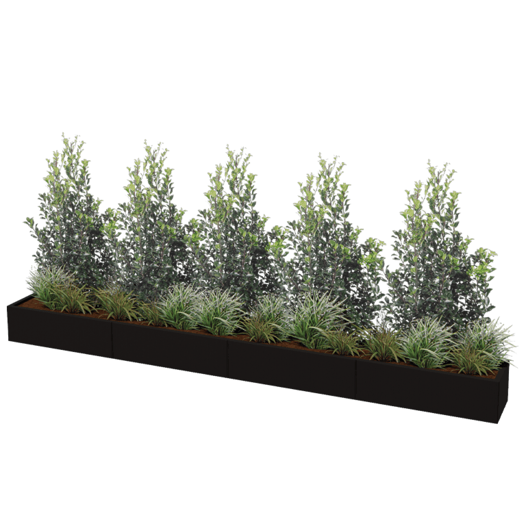 This planter is a modular steel planter that comes as a kit. The planter is constructed from individual panels and corner pieces. The planters can be connected completely blind. There are no fasteners in sight. Because of our modular system, very large dimensions are also possible. By using corner pieces, unique shapes are possible that are not available anywhere else as standard. See the manual for more information.