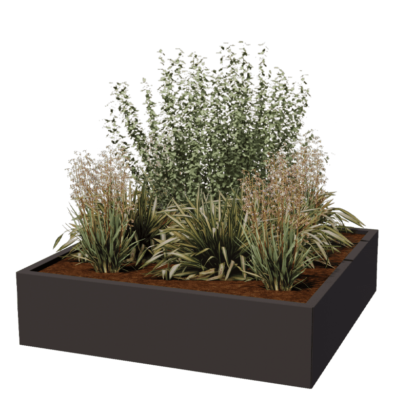 This planter is a modular steel planter that comes as a kit. The planter is constructed from individual panels and corner pieces. The planters can be connected completely blind. There are no fasteners in sight. Because of our modular system, very large dimensions are also possible. By using corner pieces, unique shapes are possible that are not available anywhere else as standard. See the manual for more information.